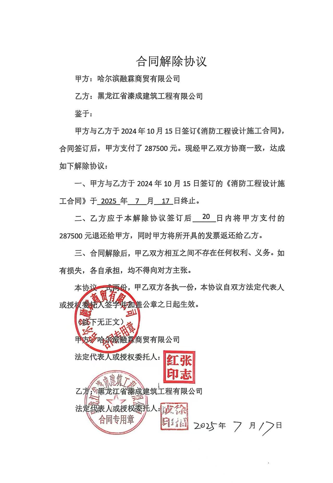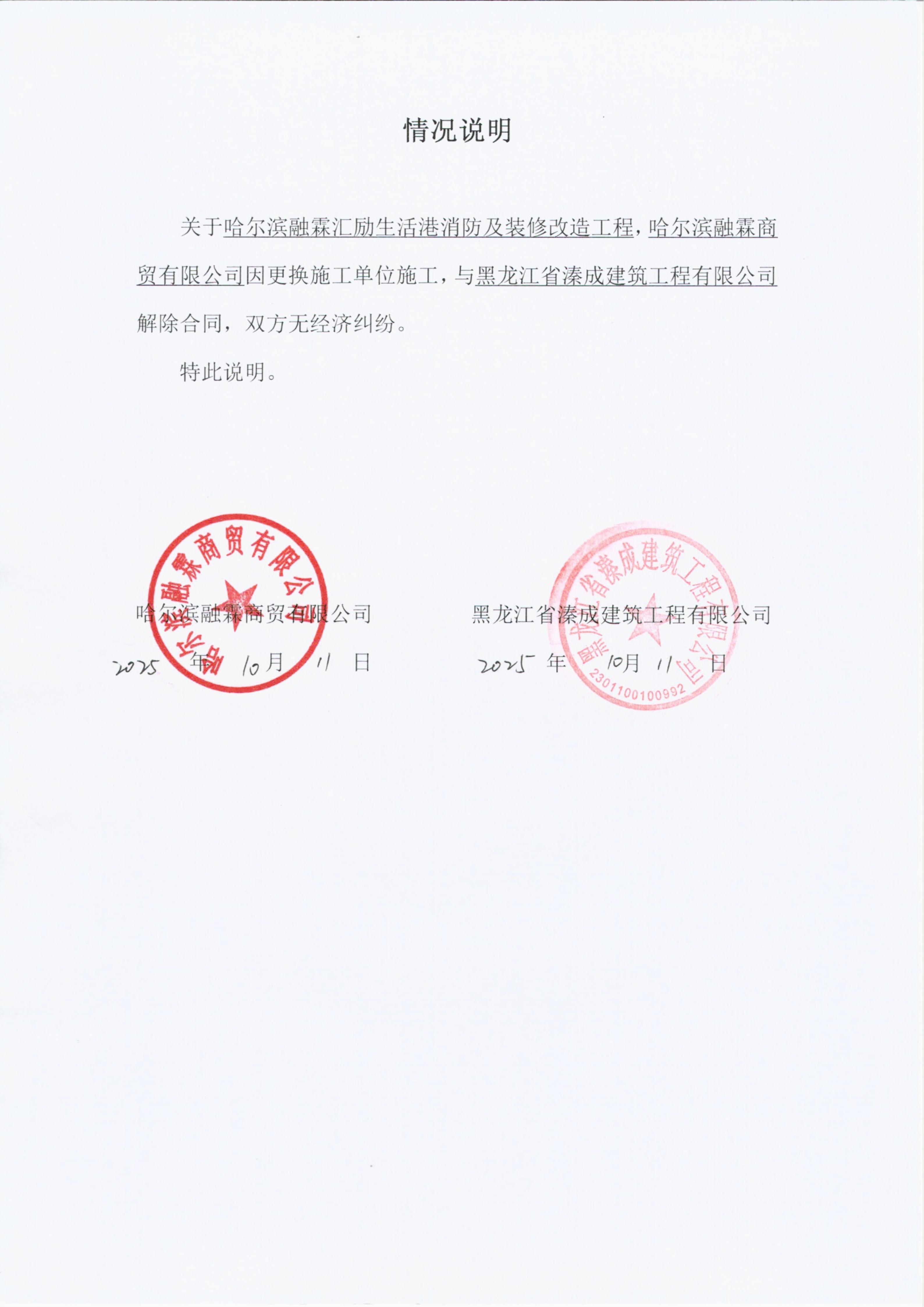 关于“哈尔滨融霖汇励生活港消防及装修改造工程”合同解除协议的情况说明